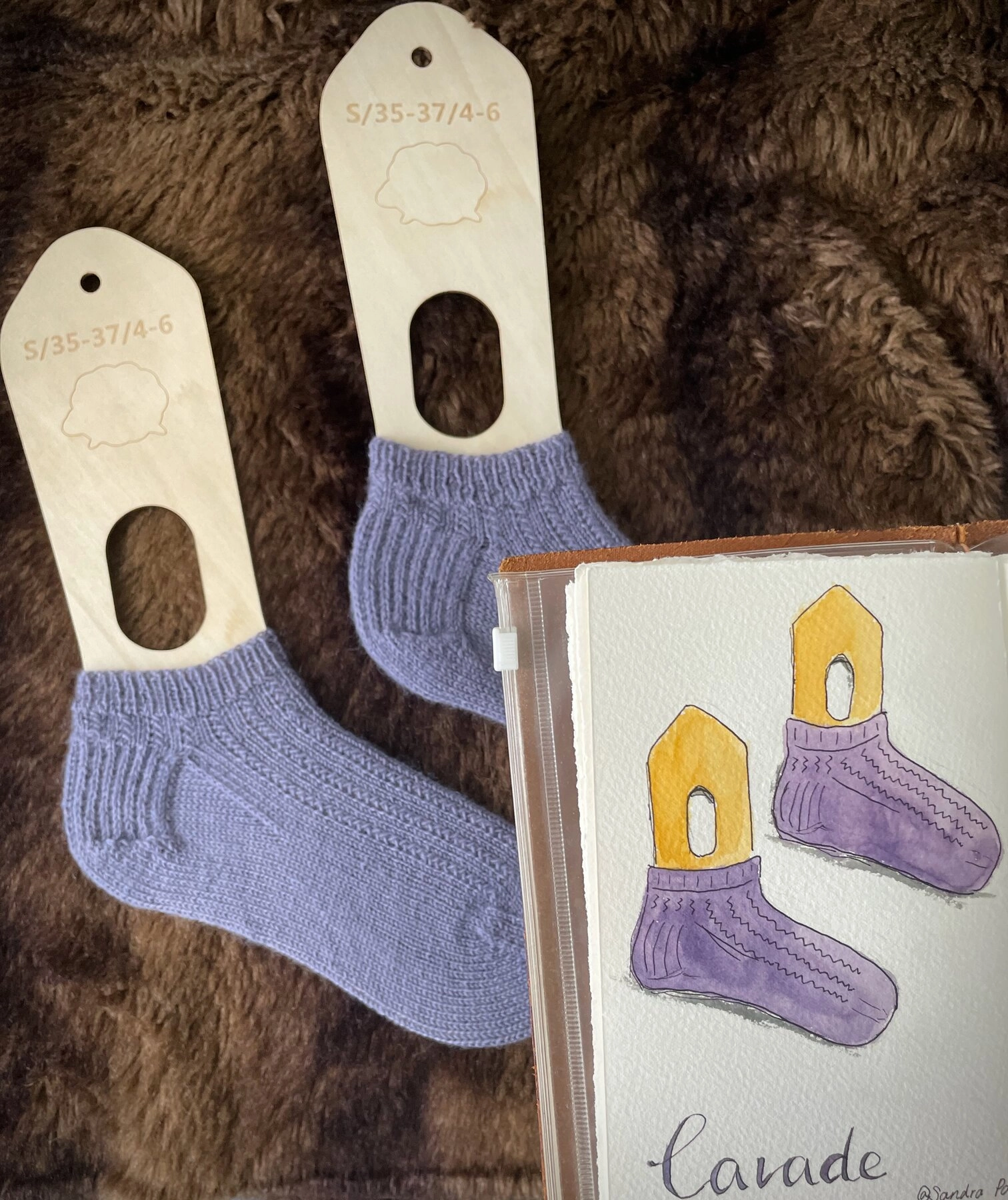 For gift socks, the main challenge is to figure out the size. I refer to the sizing chart in book Custom Socks: Knit to Fit Your Feet. I continue the pattern until the length measures 16cm from the heel, and start toe so that the final length is appx. 20.5cm.