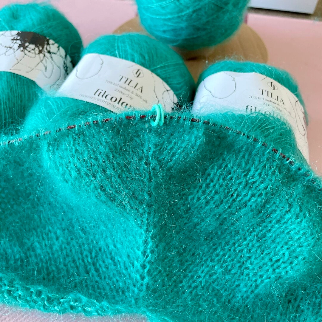 I ordered the yarn from Lil Weasel in Paris and my friend picked up for me from Paris to Canada. When buying the yarn, I thought the turquoise colour is a bit too bright to my liking so I also purchased the same yarn in grey colour and planned to hold them together to reduce saturation. However, when I got to see the actual yarn, I found the grey is too greyish and I had a feeling this won’t work. I knitted a swatch to test my colour combination - with or without the grey - and it proved my thoughts. The turquoise and grey colour blended with subtle shimmering, it’s beautiful but not suitable for my skin tone. After swatching I decided only use the turquoise yarn by holding two strands together.