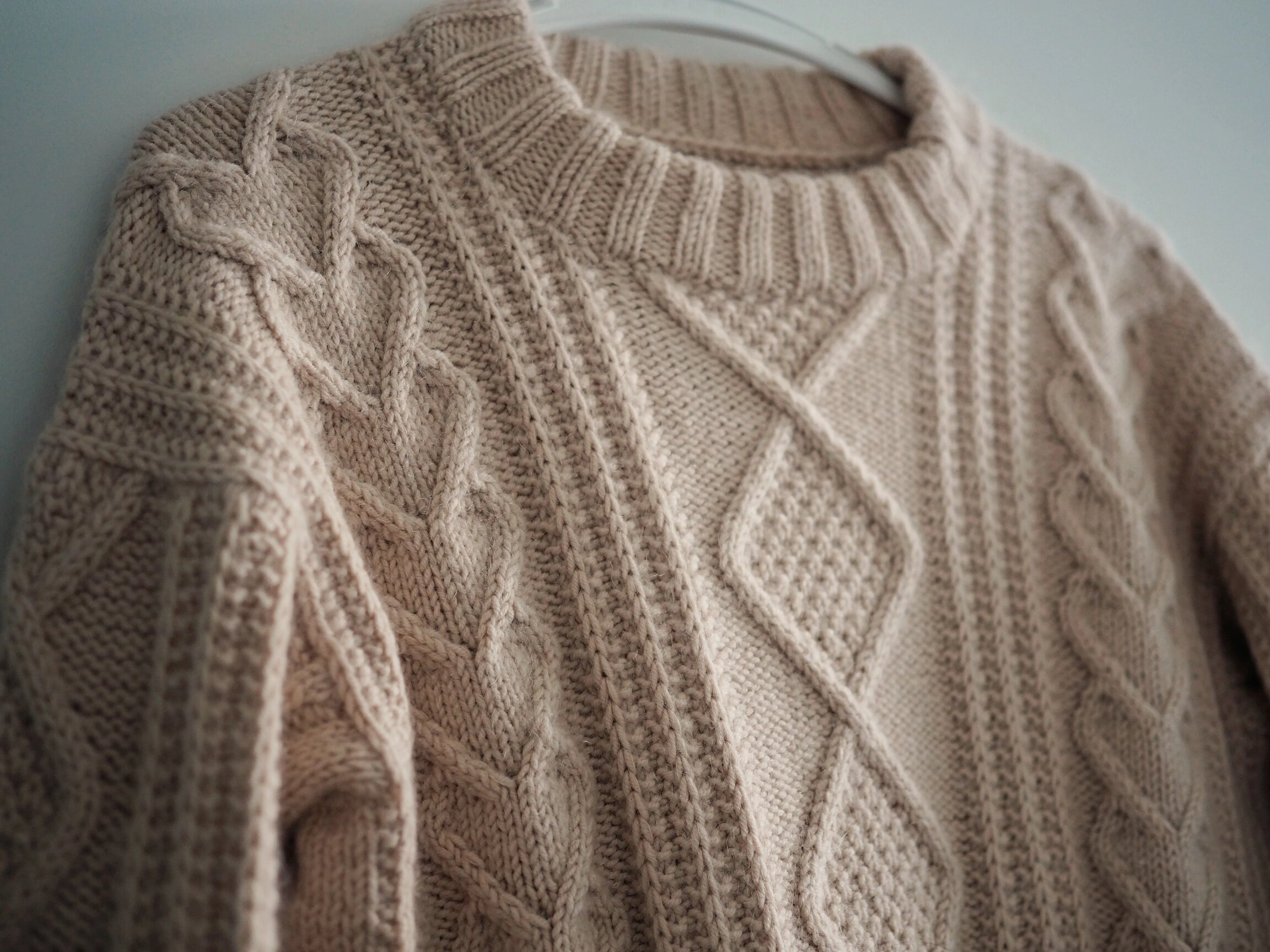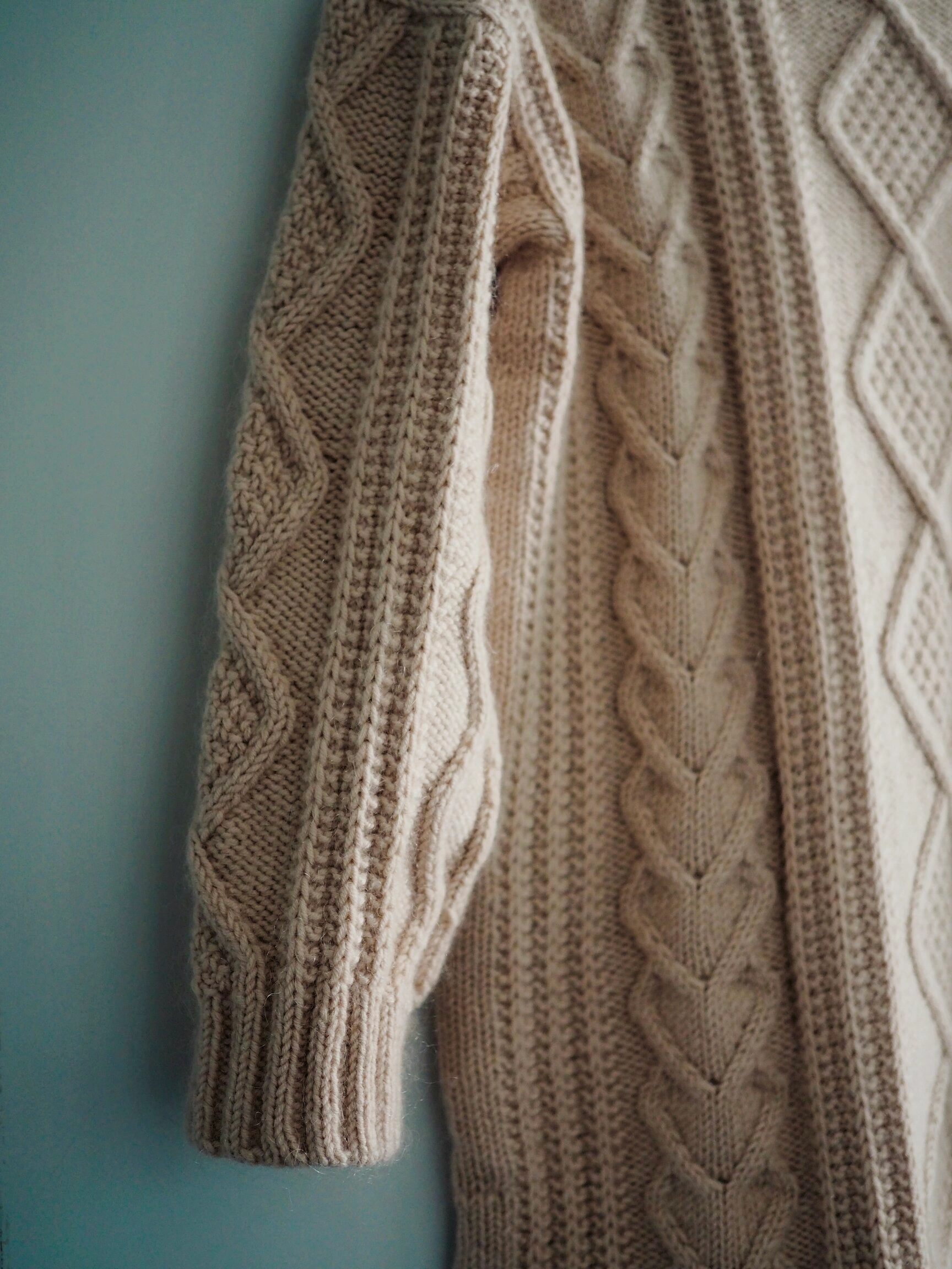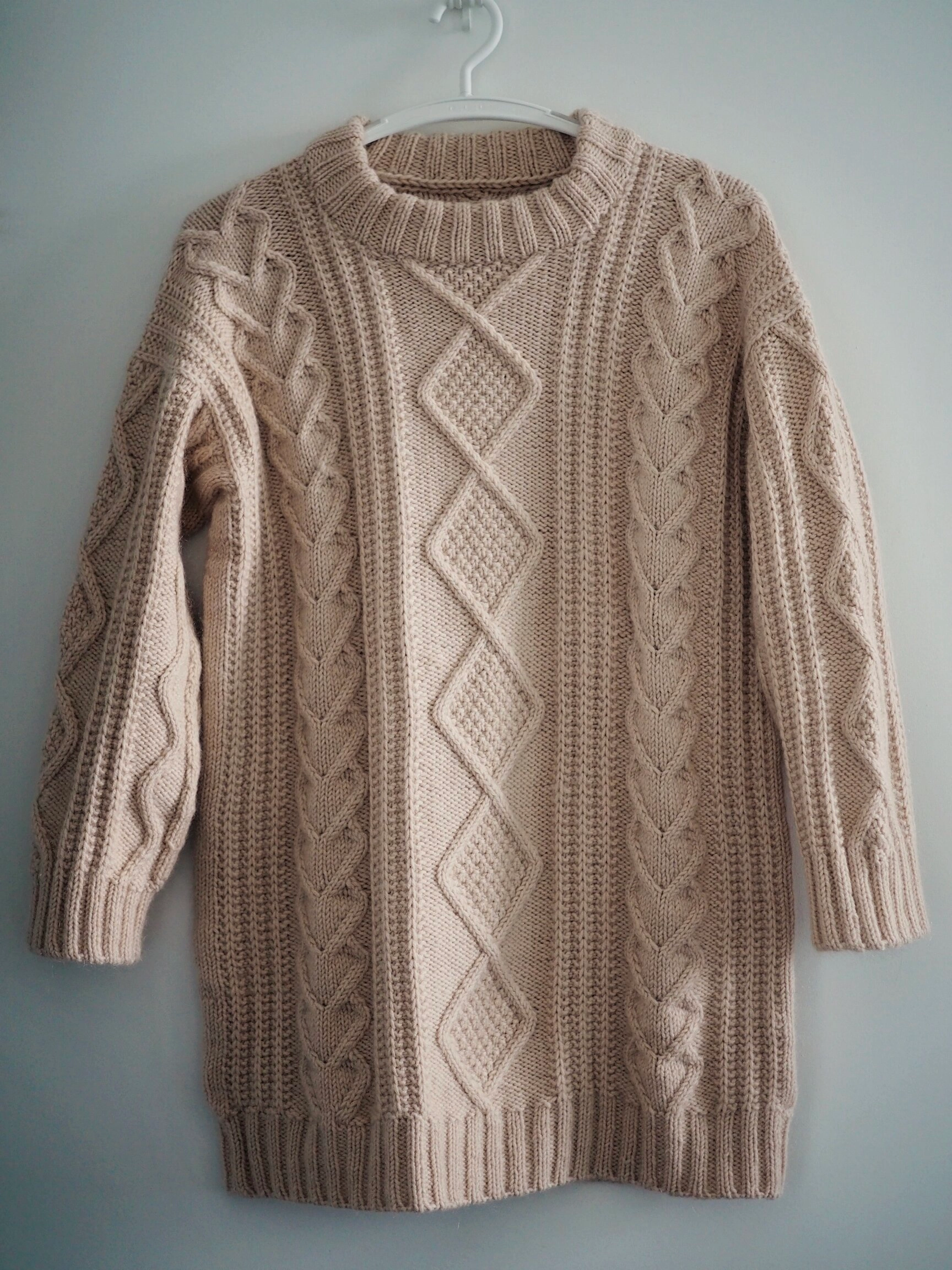 I’m planning for this sweater for a while and intend to make it as an oversized sweater dress. The original pattern has too many cables to my liking and I want a more minimalistic style, like the one I found on the internet. My idea is to replace the small cable with a slip rib pattern (I’m thinking incorporating the stitch pattern in the No Purl Scarf), so it will have diamond in the middle, and slip rib and heart cable on the side.