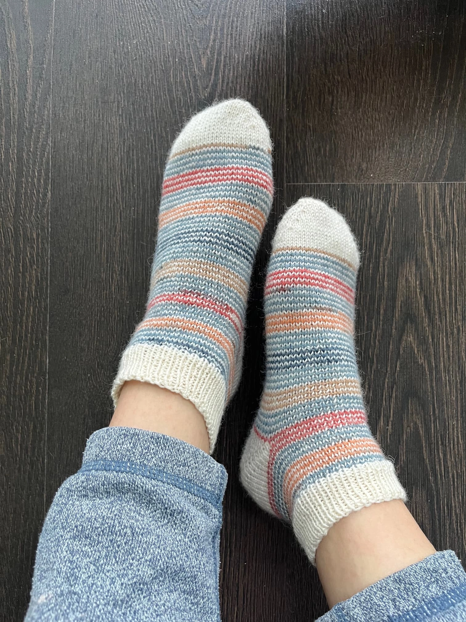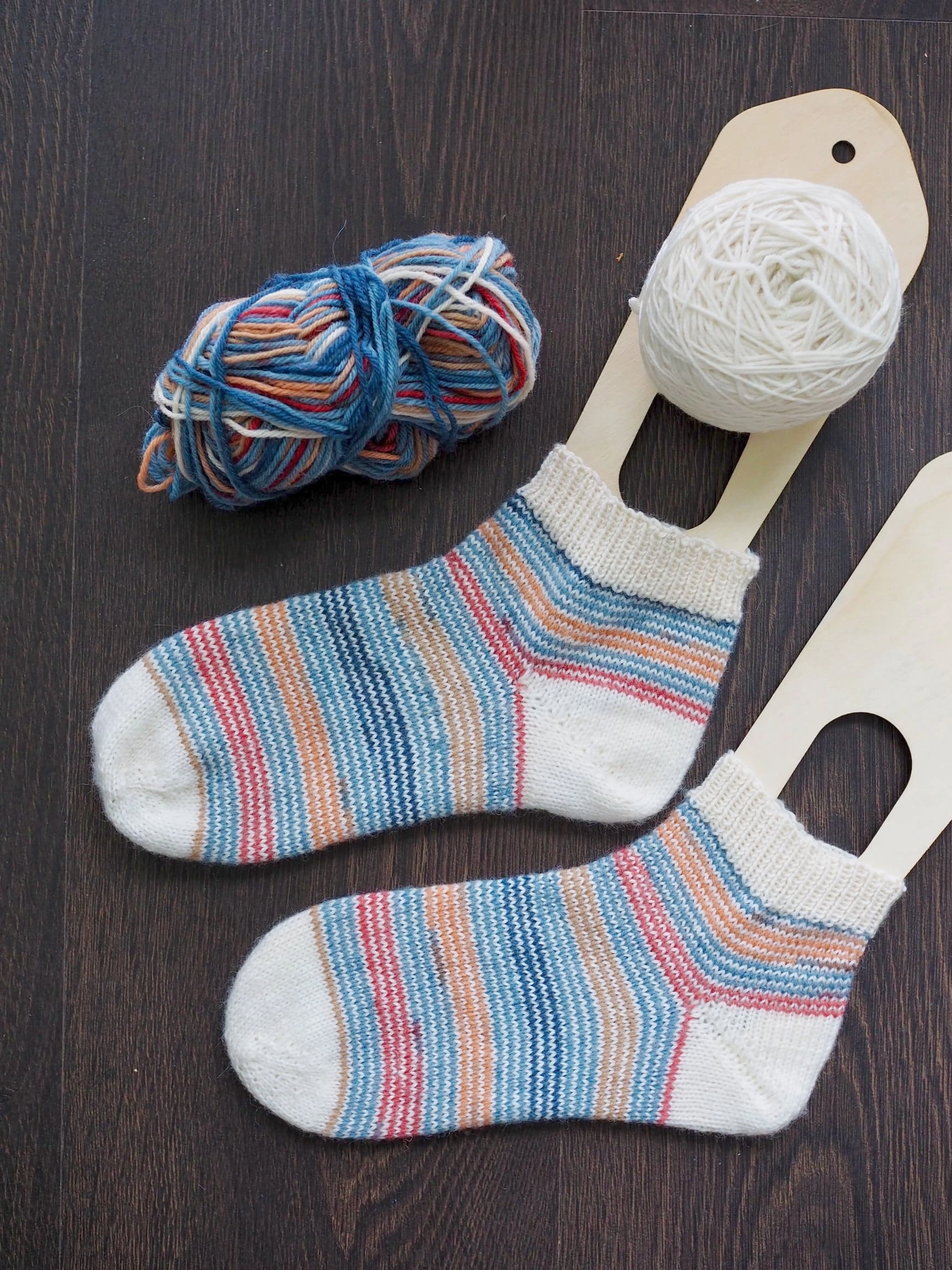 - I used helical knitting technique for the stripe but used my own toe-up sock recipe instead of following the pattern.